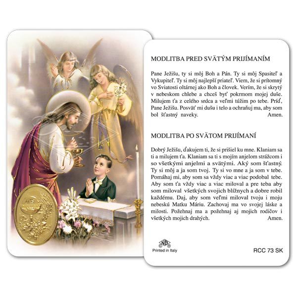 Výrobok RCC je laminovaná kartička z papiera s imitáciou zlatej medaily na prednej strane a modlitbou na zadnej strane.