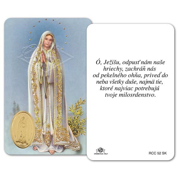 Výrobok RCC je laminovaná kartička z papiera s imitáciou zlatej medaily na prednej strane a modlitbou na zadnej strane.
