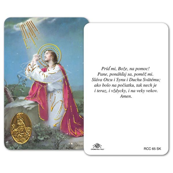 Balenie 25 ks laminovaných kartičiek z papiera s imitáciou zlatej medaily na prednej strane a modlitbou na zadnej strane.