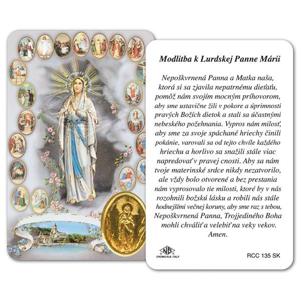 Balenie 25 ks laminovaných kartičiek z papiera s imitáciou zlatej medaily na prednej strane a modlitbou na zadnej strane.