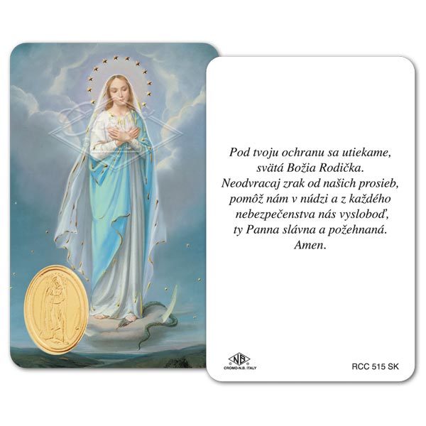 Balenie 25 ks laminovaných kartičiek z papiera s imitáciou zlatej medaily na prednej strane a modlitbou na zadnej strane.