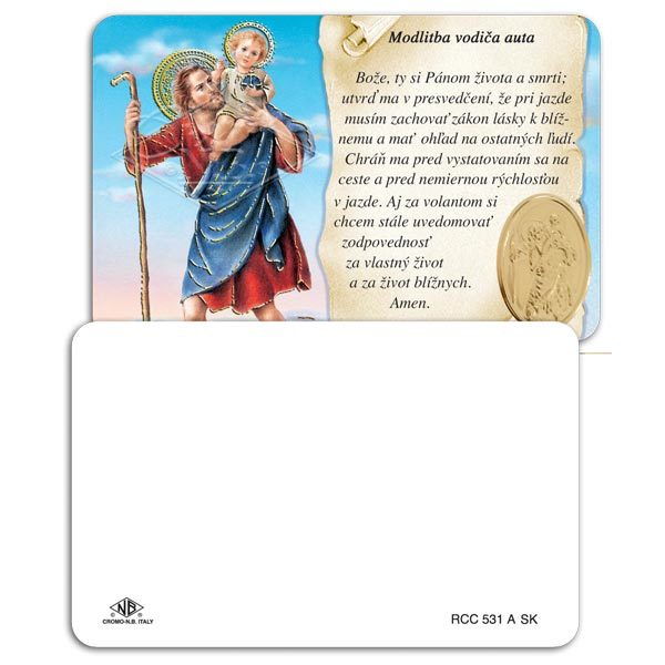 Výrobok RCC je laminovaná kartička z papiera s imitáciou zlatej medaily na prednej strane a modlitbou na zadnej strane.