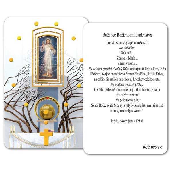 Výrobok RCC je laminovaná kartička z papiera s imitáciou zlatej medaily na prednej strane a modlitbou na zadnej strane.