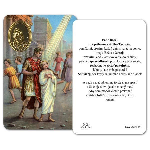 Balenie 25 ks laminovaných kartičiek z papiera s imitáciou zlatej medaily na prednej strane a modlitbou na zadnej strane.