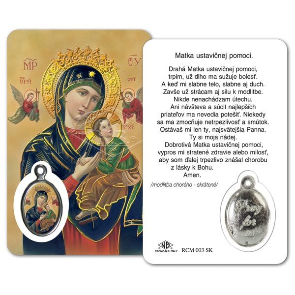Výrobok RCM je laminovaná kartička z papiera s medailónom na prednej strane a modlitbou na zadnej strane.