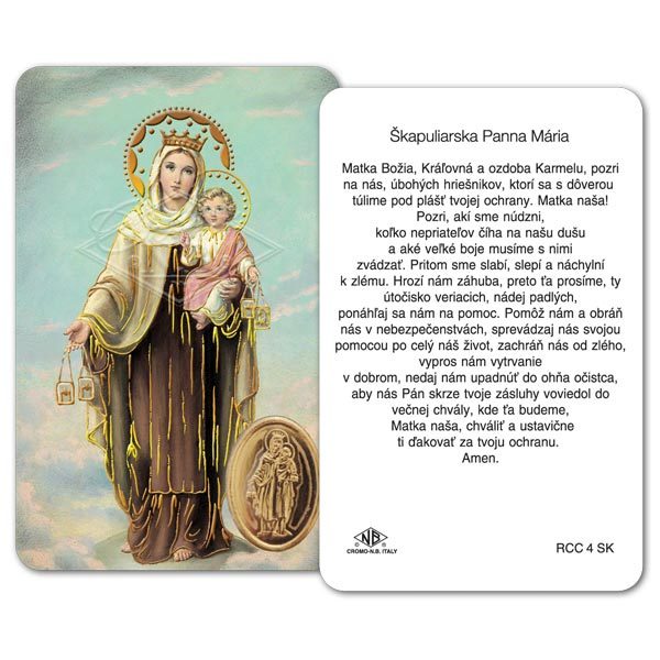 Výrobok RCC je laminovaná kartička z papiera s imitáciou zlatej medaily na prednej strane a modlitbou na zadnej strane.