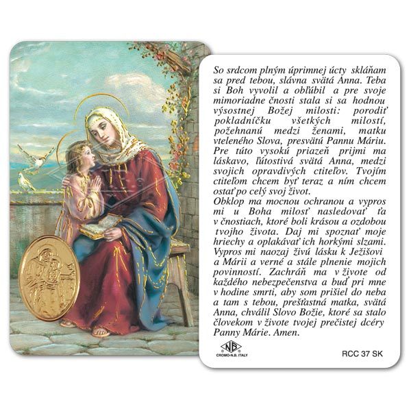 Výrobok RCC je laminovaná kartička z papiera s imitáciou zlatej medaily na prednej strane a modlitbou na zadnej strane.