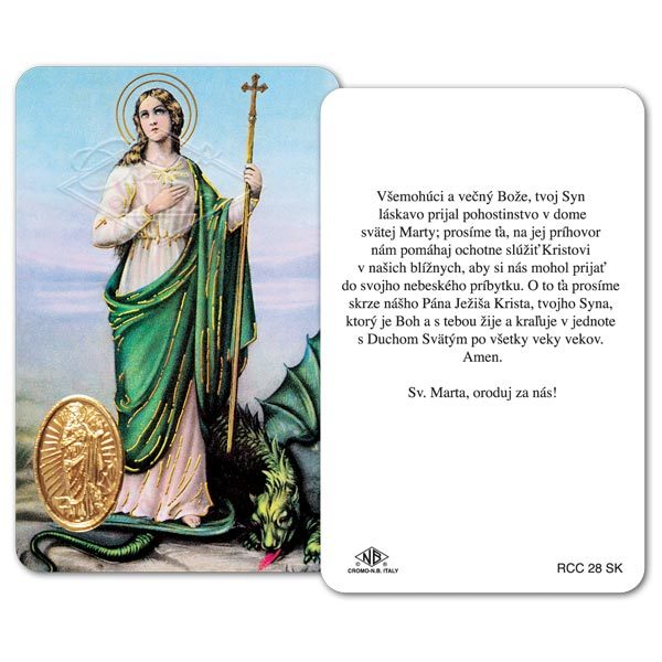 Výrobok RCC je laminovaná kartička z papiera s imitáciou zlatej medaily na prednej strane a modlitbou na zadnej strane.