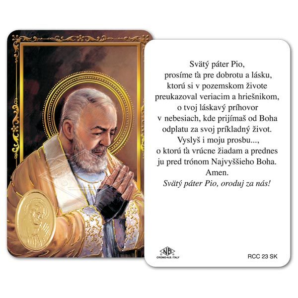 Balenie 25 ks laminovaných kartičiek z papiera s imitáciou zlatej medaily na prednej strane a modlitbou na zadnej strane.